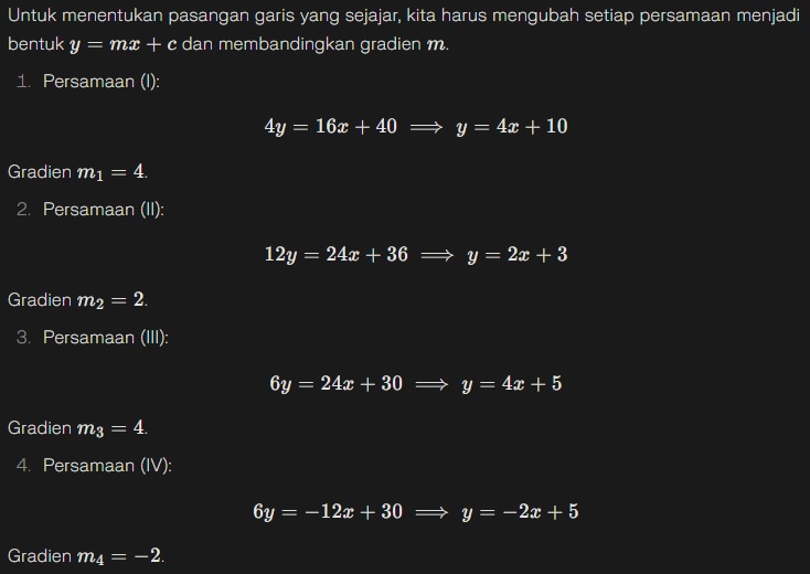 Garis yang sejajar memiliki gradien yang sama, yaitu (I) dan (III) dengan gradien 4.