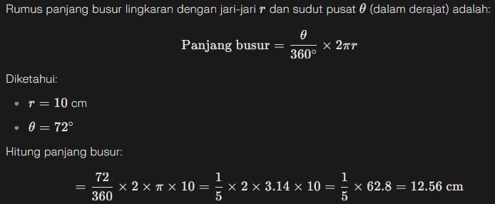 Jadi, panjang busur lingkaran adalah 12,56 cm.