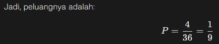 Jumlah ruang sampel total = 6 × 6 = 36 (karena tiap dadu memiliki 6 sisi).