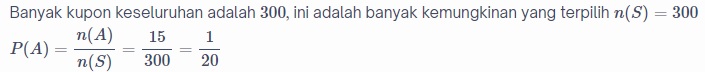 - Dalam suatu acara untuk memperingati Hari Kemerdekaan, ketua RT mengadakan undian berhadiah dengan hadiah utama sebuah sepeda. Jika dalam undian tersebut terdapat 300 kupon. Andi ingin mendapatkan hadiah utama dengan memiliki 15 kupon. Peluang Andi untuk mendapatkan sepeda adalah...