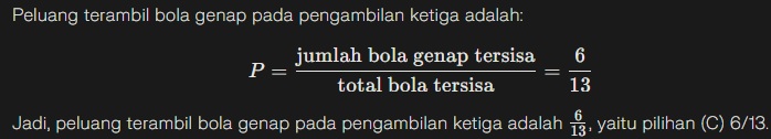Bola genap 1 buah diambil dan tidak dikembalikan, tersisa 7 bola ganjil dan 6 bola genap.
