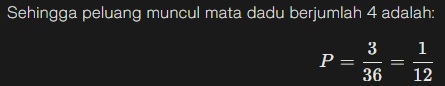 - Dua buah dadu dilambungkan bersamaan. Peluang muncul mata dadu berjumlah 4 adalah...