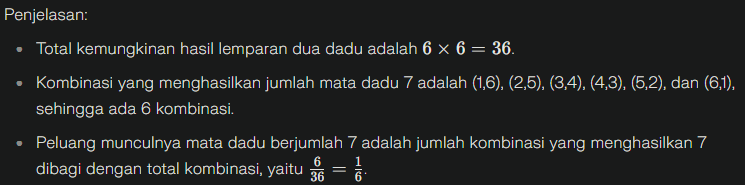 - Dua dadu bermata 6 dilempar sekali secara secara bersamaan, peluang muncul mata dadu berjumlah 7 adalah...