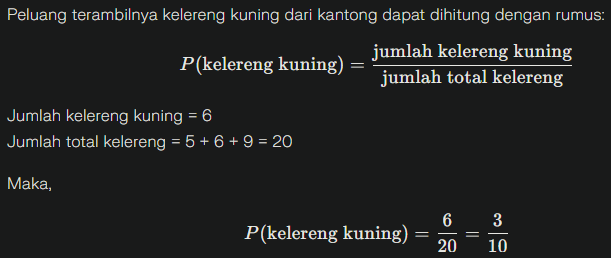 - Sebuah kantong berisi 5 kelereng merah, 6 kelereng kuning, dan 9 kelereng hijau. Sebuah kelereng diambil dari kantong tersebut. Peluang terambil kelereng kuning adalah...