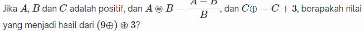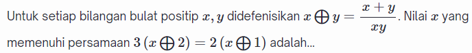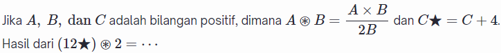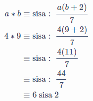 - Untuk sembarang bilangan bulat a dan b, diberikan a∗b artinya bilangan yang merupakan sisa a(b+2) dibagi oleh 7. Maka bilangan yang ditunjukkan 4∗9 adalah...