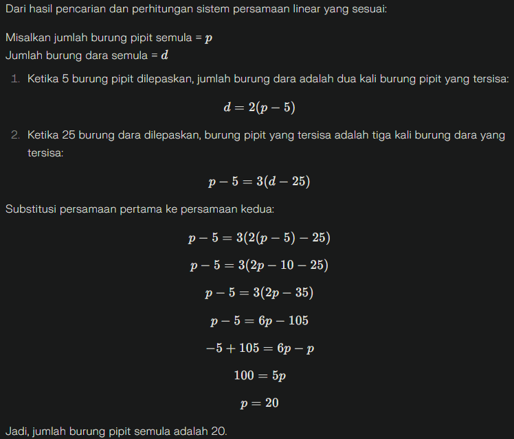 - Pada suatu penangkaran terdapat burung pipit dan burung dara. Ketika 5 burung pipit dilepaskan, jumlah burung dara dua kali burung pipit yang tersisa. Kemudian, ketika 25 ekor burung dara dilepaskan, burung pipit yang tersisa adalah 3 kali burung dara yang tersisa. Jumlah burung pipit semula adalah...