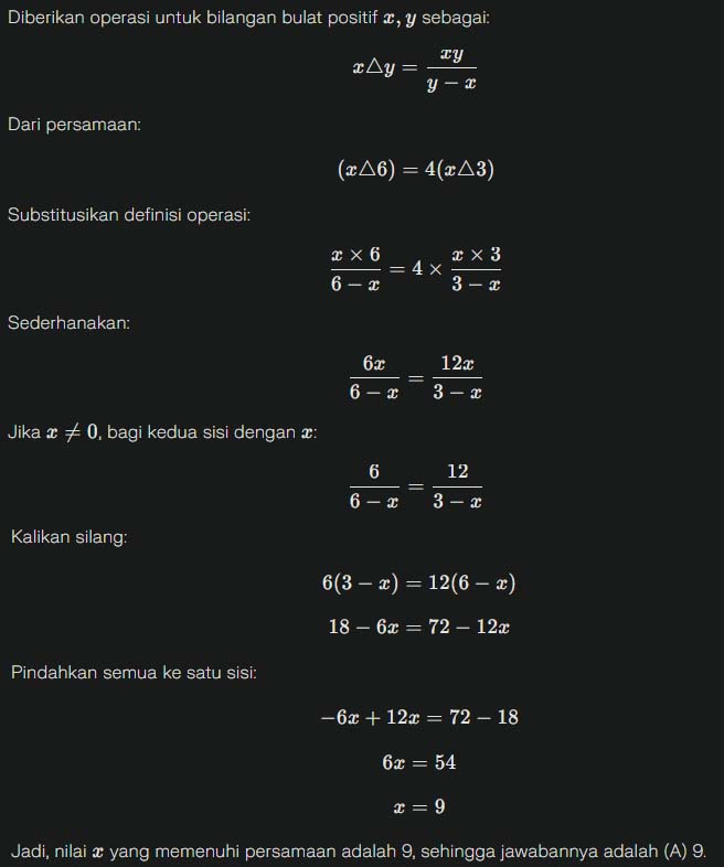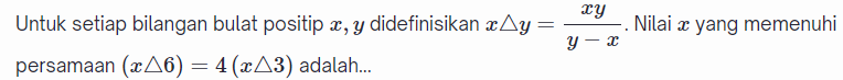 - Operasi "△" berarti kalikan bilangan pertama dengan 5, kemudian jumlahkan hasilnya dengan 3 kali bilangan kedua.
