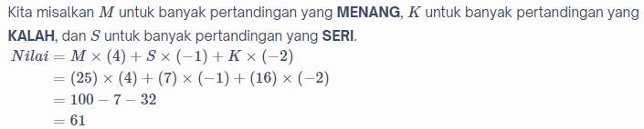 - Dalam suatu permainan bila menang diberi nilai 4 tetapi bila kalah diberi −2 dan bila seri diberi nilai −1. Suatu regu telah bermain sebanyak 48 kali dengan 25 kali menang dan 7 kali seri, maka nilai yang diperoleh regu tersebut adalah...