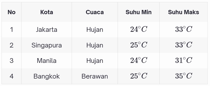 - Berikut data prakiraan cuaca empat kota di Asia Tenggara.