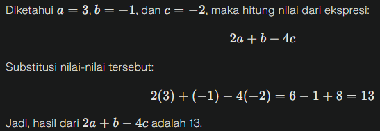 - Diketahui nilai a=3, b=−1, dan , c=−2, maka hasil dari 2a+b−4c adalah...