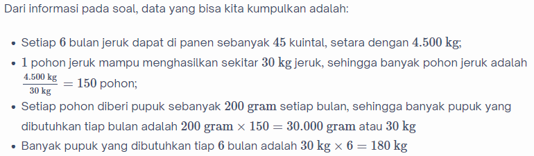 - Paman memiliki kebun jeruk dengan luas 1 hektar. Setiap 6 bulan, paman dapat memanen jeruk sebanyak 45 kuintal dan 1 pohon jeruk mampu menghasilkan sekitar 30 kg jeruk. Agar hasil panen selalu maksimal, paman memberi pupuk untuk setiap pohon sebanyak 200 gram setiap bulan. Banyak pupuk yang dibutuhkan paman selama 6 bulan adalah....