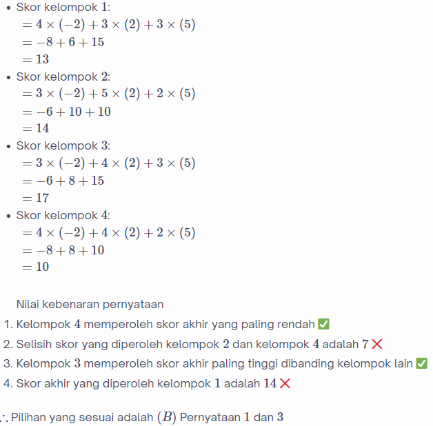 - Budi menjawab soal dengan Salah 4 soal, skornya 4 × (−2) = −8